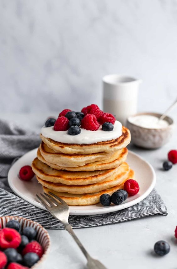 Servir: Sirve los pancakes calientes. agregar un poco más de yogurt griego por encima mezclado con limón y ½ cucharada de miel.