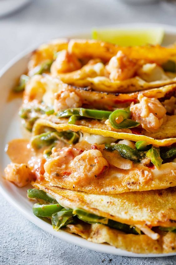 Armar los tacos: Rellena cada tortilla con la mezcla de camarones y chiles poblanos. Añade el queso rallado por encima.